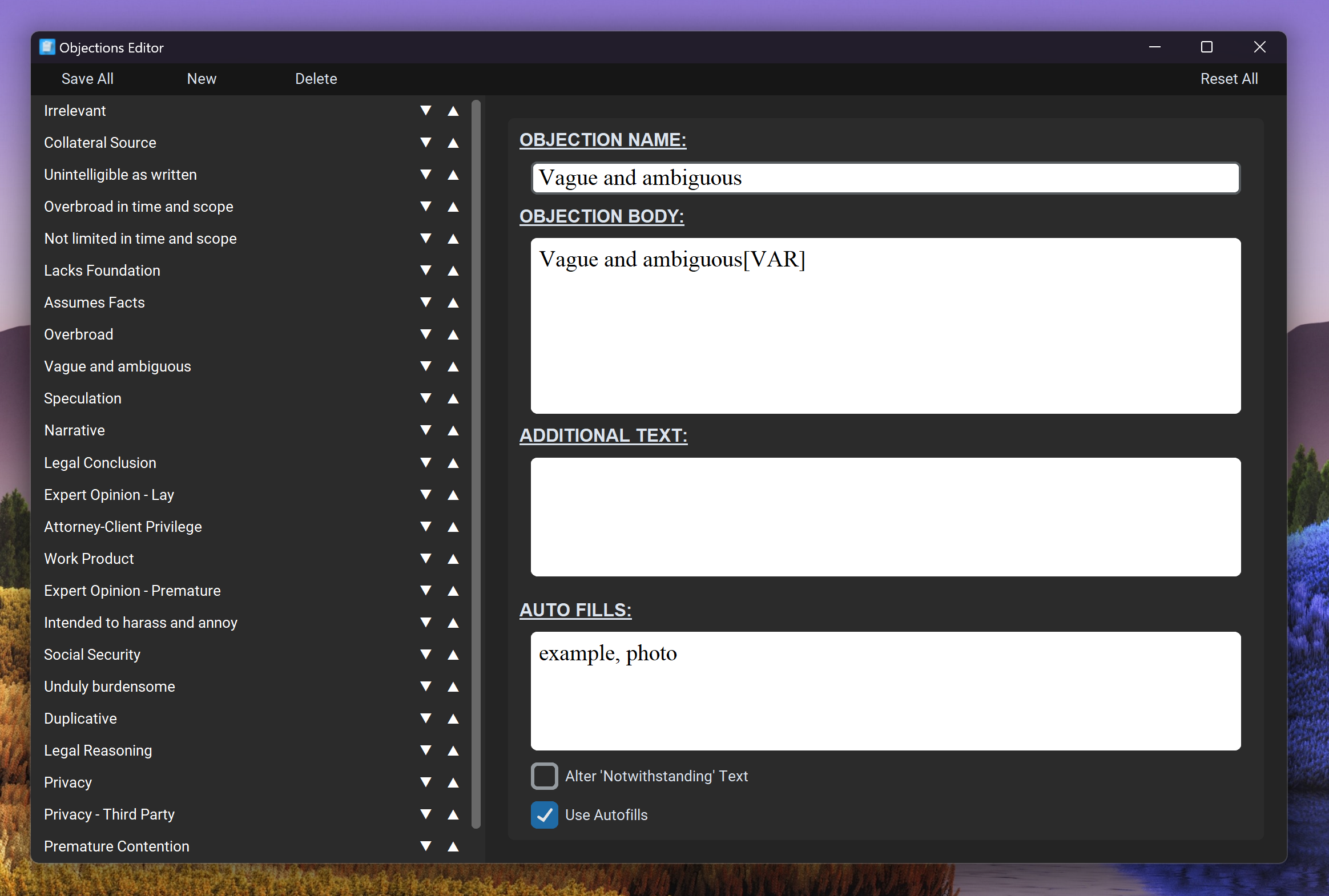Objections are listed in the objection panel on the right side of the editor. When left-clicked, that objection will be toggled for the current request (turning green). This objections text will then be added to the requests objection box. When right-clicked, the objection will be selected, allowing you to add list items into the objection if [VAR] is present in the objections text body or additional text body. The final response output for each request will be follow the order Objections, NotWithtanding Text, Response, Additional Text. The Notwithstanding Text is only added if there are objections selected, by default it is: