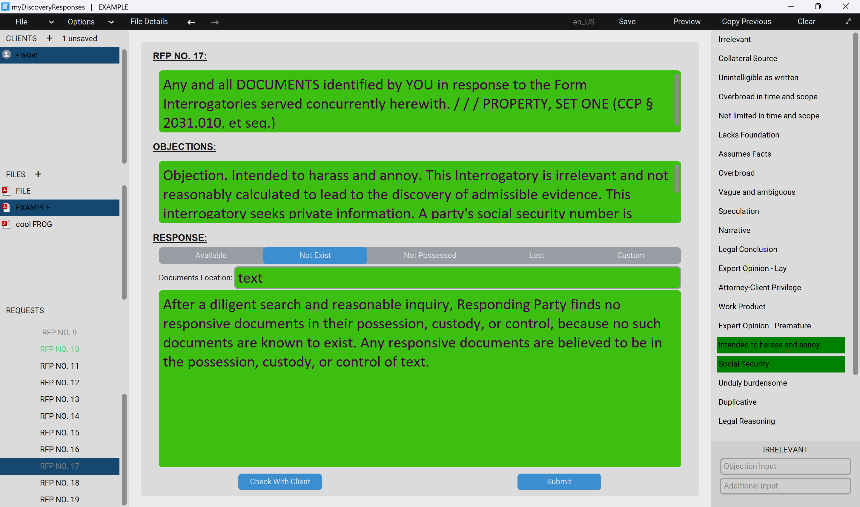 The bespoke software, myDiscoveryResponses, is designed for the production and editing of discovery responses. Using the software, you can load discovery request pdf's of type: Requests for Admissions (RFA), Demands for Production (RFP), Special Interrogatories (SPROG), Form Interrogatories (FROG). These are loaded using natural language processing and OCR techniques, in order to extract the correct requests and file details from the pdf files. Once loaded, you can move between each request and check off objections; in addition to adding custom responses. When these responses have been created, the file can then be exported as a response word document (DOCX), or saved for future editing as a .discovery file.